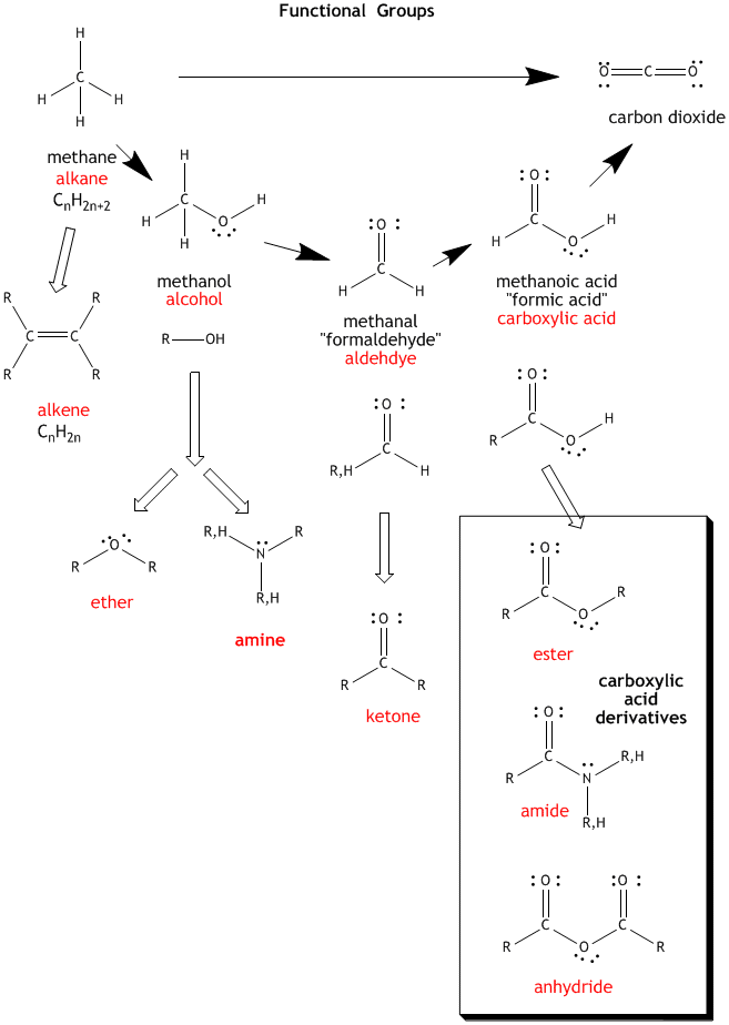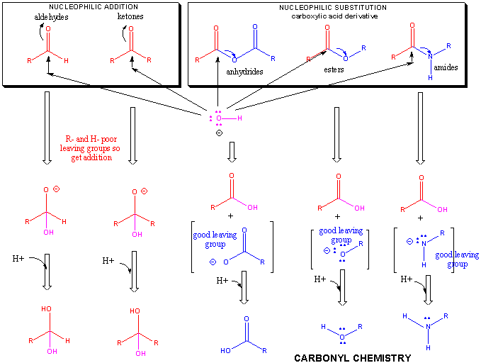 The carbonyl group, C=O, is found in many of the functional groups. Since the C is slightly positive, it is the site of attack for negatively charged groups like OH- and slightly negative groups oxygens such as in H2O. The chemistry of the functional groups with a carbonyl depend on which other groups are attached to the C. If only R groups and Hs are attached, the negative or slighty negative group that attacks the carbonyl C adds to the C. This occurs since R and H groups attached directly to the carbonyl C are poor leaving groups. They are unstable in aqueous solution since the negative on each leaving group is on atoms of low electronegativity (C and H respectively). Hence they are high in energy, very reactive and unstable, and not likely to be formed in aqueous solution. In contrasts, carboxylic acid derivatives like anhydrides, esters, and amides have an electronegative O or N directly attached to the carbonyl C. Hence when the negative or slightly negative O on the attaching molecule forms a bond to the carbonyl C, the group attached to the carbonyl C with an O or N can leave, since the negative charge on the departing leaving group will be on the electronegative O and N. Hence the negative or slightly negative O on the attaching molecule substitutes for the departed leaving group.