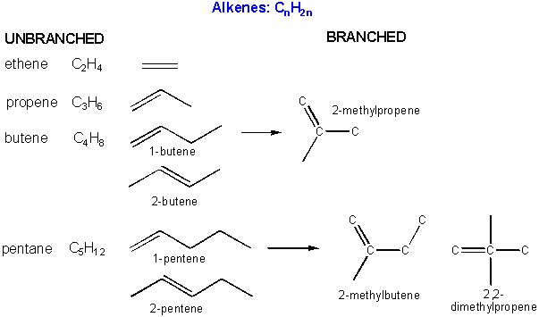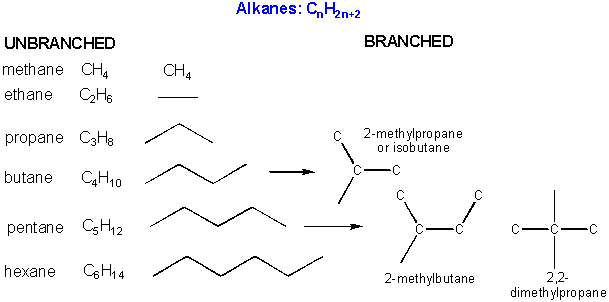 There are millions of different type of organic molecules. Some, composed of just hydrogen and carbon, are called hydrocarbons. Most biologically relevant organic molecules contain other atoms, including O, N, P, S, etc. We have already discussed sugars like glucose, which has the structure C6(H2O)6 - a carbohydrate. Among the hydrocarbons, we will discuss only the simplest - alkanes, which contain C-C single bonds, and alkenes, which have one or more C-C double bonds. Alkanes have the general molecular formula, CnH2n+2, while alkenes with one double bond have the general molecular formula CnH2n. Alkanes and alkenes can contain straight or branched chains of carbon atoms.
