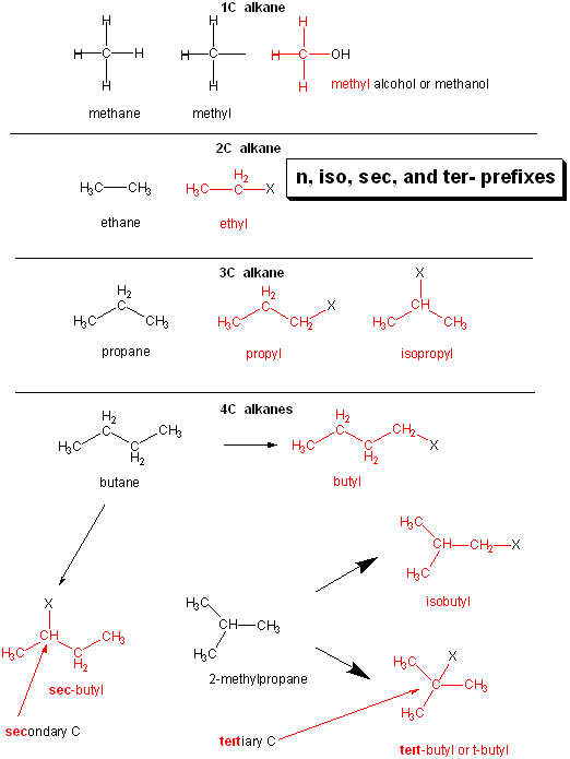 Most organic molecules contain other atoms like O and N, which substitute for a H or C. New chemical functional groups can be created. For example, CH3OH contains a functional group called an alcohol, abbreviated as ROH, where R is a CH3- which is named methyl. Different R groups are shown below: