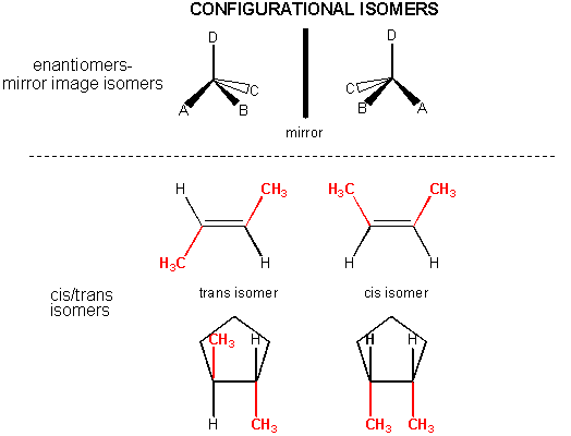In addition, there are some organic molecules with the same molecular formula and same Lewis structure (hence they have the same connections between atoms in the molecues), but they differ from each other in the 3D - orientation of their atoms in space. They cannot be converted to each other by rotation around single bonds. These are called configurational isomers . Two major examples are shown below.