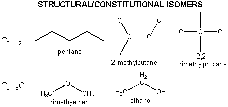 Organic molecules can have the same molecular formula but different structural formulas - i.e. the atoms are connected in different ways. Hence these molecules are not identical - they are different. They are called structural or constitutional isomers . Examples are shown below.