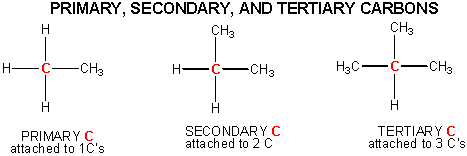 Some carbon chains are linear, some are branched. Carbon atoms in organic molecule can have 1, 2, or 3 carbons attached to them. These are called primary, secondary, and tertiary carbons.