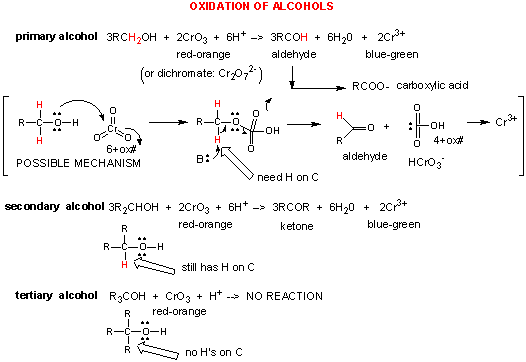 In the lab, primary alcohols can be oxidized to aldehydes and carboxylic acids, while secondary ones can be oxidized to ketones by oxidizing agents like CrO3. In cells, ethanol is oxidized by a biological oxidizing agent, NAD+ (nicotinamide adenine dinucleotide), which along with ethanol binds to the active site of the enzyme, alcohol dehydrogenase. The mechanisms for these reactions are shown below. They are complicated, but you should be able to clearly see that the alcohol has been oxidized as it is converted to product. That is the take-home message from these figures.