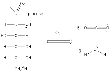We will concentrate on the metabolism of glucose, a simple sugar. As we extract energy from hydrocarbons and ethanol by oxidation with oxygen, so do we get energy from glucose by oxidation. The next process takes glucose to carbon dioxide and water, as show below: