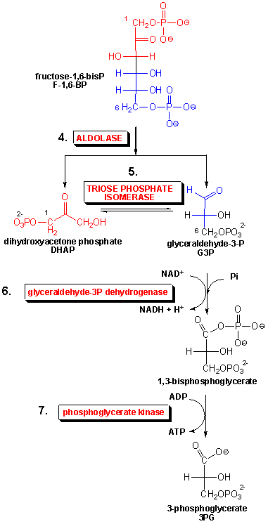 In this pathway a glucose molecule (C6) is split into 2 - 3 carbon molecules (2 - C3). One of the carbons in each 3 C molecule is oxidized. ATP is then made. These three processes are shown in reaction steps 4 (break C-C bond), 6 (oxidize C), and 7 (make ATP) of glycolysis shown below: