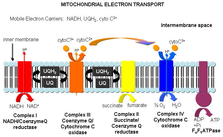 As glycolysis would grind to a halt in the absence of oxygen unless NAD+ was regenerated by reacting pyruvate and NADH to give lactate and NAD+, so there must be an analogous system to regenerate NAD+ during aeroboic conditions. This pathway occurs in the mitochondria of the cells and the enzymes involved are all membrane protein complexes. NADH passes two electrons (i.e. it gets oxidized back to NAD+) through a series of membrane protein catalyst to a series of small electron carriers which progressively like to accept electrons more and more (from UQ to cytoC3+ and finally to oxygen, a great oxidizing agent and acceptor of electrons). The process of electron transport (oxidation) is coupled to the synthesis of ATP from ADP and Pi, catalyzed by the membrane protein ATPase. So in the process of reforming NAD+, we make lots of ATP which can be used to power unfavored reactions (like DNA synthesis, the formation of ion gradient, and muscle contraction).
