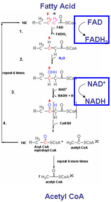 This pathway is shown below. Note that the fatty acid is broken into the C2 molecule acetyl CoA which can enter Krebs Cycle as shown above. In addition, the reduced fatty acid chain is oxidized in many steps by FAD and NAD+ to form FADH2 and NADH. These can then enter ox-phos as shown above when then become oxidized in a series of steps which passes electrons onto oxygen. In the process, much ATP is created.