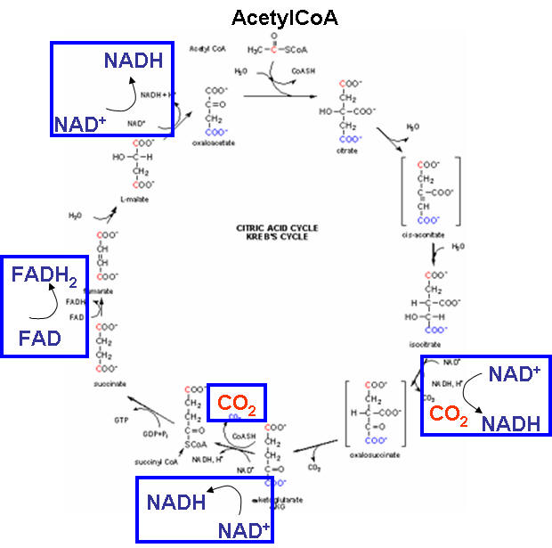 3 oxidations by NAD+ and one by FAD occur for each acetyl CoA that enters the cycle. This causes a buildup of the NADH and FADH2 molecules, and leave the oxidizing agents, NAD+ and FADH2 depleted. The reduced forms (NADH and FADH2) must be reoxidized for the cycle to continue. They are in a process called electron transport or oxidative-phosphorylation (see Pathway 3: electron transport/ox. phos. below) in a process which requires oxygen. This aerobic process is similar to what we saw in glycolysis for the regeneration of NAD+ under anaerobic conditions when lactate was produced.