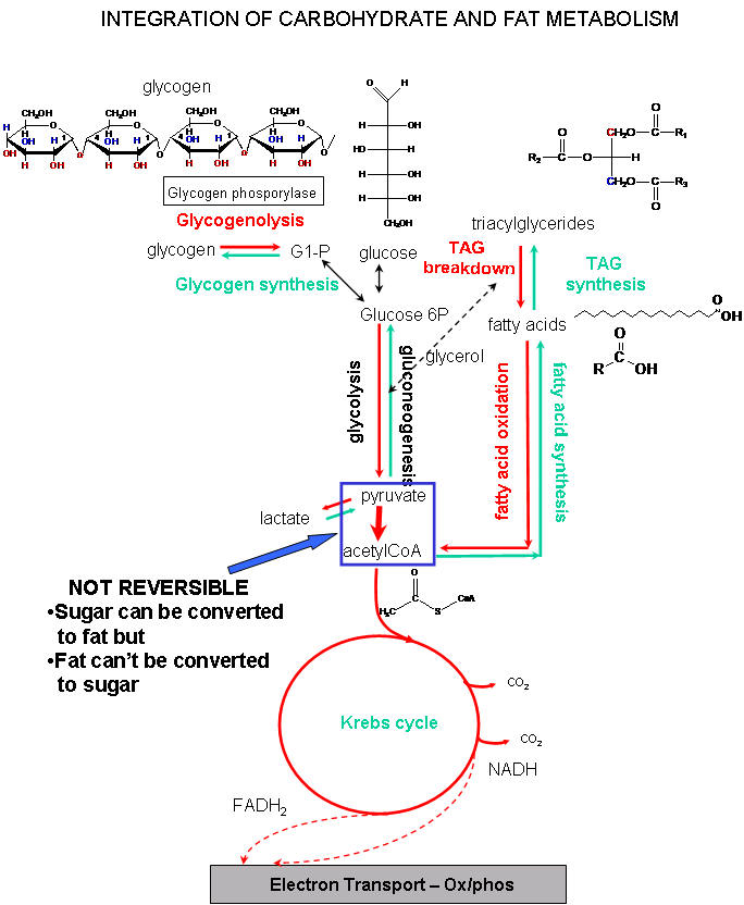 Metabolic pathways don't stand in isolation, but rather are linked to each other in complicated patterns. The simplified metabolic pathway below shows the relationship between carbohydrate and fat metabolism. A common intermediate in both pathways is Acetyl CoA. It can be produced by both glucose and fat breakdown. It can also be used to synthesize fat. However, given the irreveribility in the body of the step that takes pyruvate to acetyl CoA (in the blue box), acetyl CoA from fat breakdown can not be used to synthesize glucose. Carbohydrates can be converted to fat, but fat cant' be converted to sugars.
