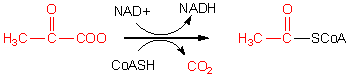 In the presence of abundant oxygen, pyruvate (C3) is oxidized to acetyl-CoA (C2), shown above, by NAD+. In the process CO2 is released, one of our goals of oxidative metabolism of glucose. Since two pyruvates (C3) are produced from each glucose (C6), the net effect of two pyruvates being converted to two acetyl-CoA is the generation of 2 CO2 molecules. We have 4 more CO2 molecules to produce to fully convert all of the C atoms in Glucose to CO2. This steps takes place in the mitochondria of the cell. The NADH produced also needs to be reoxdized back to NAD+. This occurs in an oxygen-dependent pathway (see Pathway 3: electron transport/ox. phos. below).