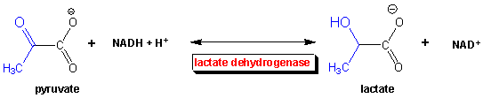 When you run really fast, you soon feel terribly. Besides being fatigued, your muscles feel heavy. You probably attribute it to lactic acid (or the deprotonated form lactate) building up in your blood. Why does this happen? You're running out of oxygen when you are running that fast. The oxygen is needed to continue the oxidation of pyruvate to CO2 and H2O in the pathways shown below. So pyruvate builds up in the muscle cells, and so does NADH. You need ATP to keep running so you have to keep glycolysis going, but there is a big problem. The oxidizing agent used in glycolysis (NAD+) is being converted to NADH. Unlike oxygen, which you constantly breath in, you only have a limited "pool" of NAD+ in your cells. To regenerate it you need to take NADH and reoxidize it back to NAD+. This occurs as whatever oxidizes the NADH is reduced. To get NAD+ regenerated in the absence of oxygen, the enyzme lactate dehydrogenase reduces pyruvate to lactate.