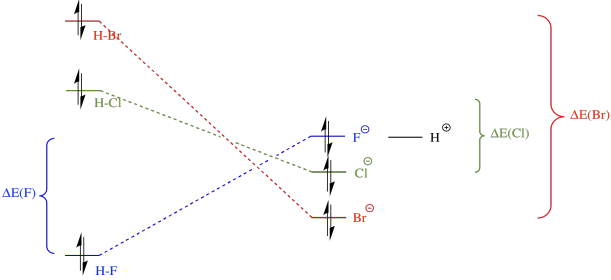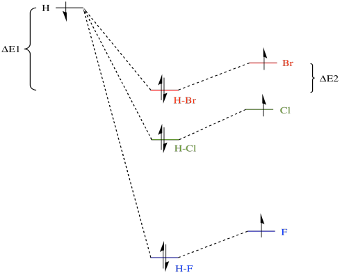 Bond strengths actually vary in this way indirectly because of the relative electronegativities of the halogens. The valence electrons on fluorine, a more electronegative atom, are at a lower energy than those on either bromine or chlorine. When the valence electrons on a hydrogen atom and a halogen atom combine to form a bond, the bonding combination is at a lower energy than either of the originals.